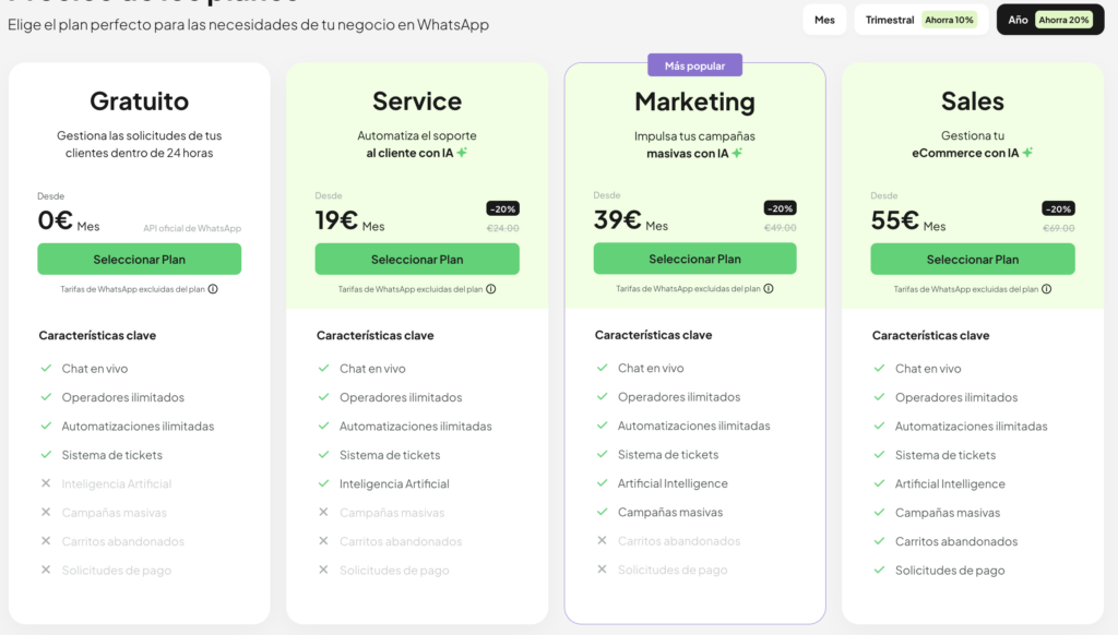 El modelo de precios de Spoki está diseñado para pagar por lo que usas: eliges un plan según el nivel de automatización y objetivos (Atención, Marketing o Ventas) y luego añades el coste real de las conversaciones de WhatsApp que se generan con tus clientes. Para pymes y equipos que están empezando a profesionalizar WhatsApp, esto ofrece flexibilidad y posibilidad de escalado sin costes fijos altos desde el inicio.